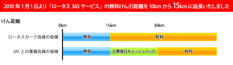 ※JFA との重複会員メリットについても無料けん引距離を 25km から 30km へ延長しました。※ロータス店以外が現場対応した場合に全額お立替えいただき、後日無料キャッシュバックさせていただくことがございます。 |
