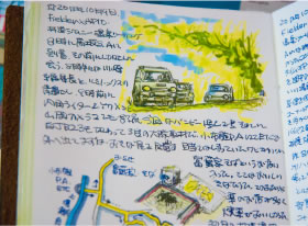 納車の際にお客様に進呈するトラベラーズノート、店内にあるサンプル本には河野社長自ら描いた林道旅行のスケッチも。